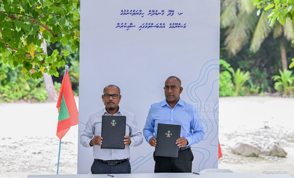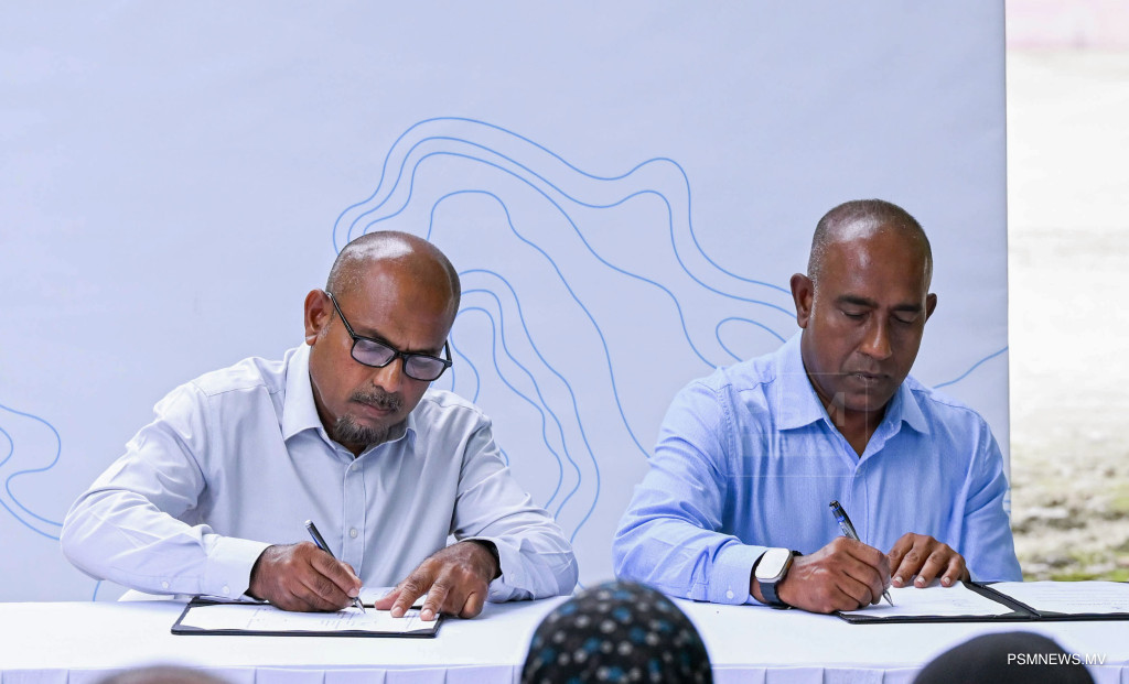 ށ. ފޭދޫގެ ގޮނޑުދޮށް ޙިމާޔަތްކުރުމާއި މަގުތައް ޒަމާނީ ފެންވަރަށް ތަރައްޤީކުރުމުގެ މަސައްކަތް ހަވާލުކުރުމުގެ އެއްބަސްވުމުގައި އިމާރާތްކުރުމާ ގެދޮރުވެރިކަމާ ބެހޭ ވުޒާރާގެ ސްޓޭޓް މިނިސްޓަރ ޙަސަން ރަޝީދު އަދި އެމްޓީސީސީގެ ފަރާތުން ސޮއިކުރެއްވީ، މެނޭޖިން ޑިރެކްޓަރ ޑީސީޕީ ރިޓަޔާޑް އަޙްމަދު ސަޢުދީ ސޮއިކުރައްވުމަށްފަހު / ފޮޓޯ - ރައީސް އޮފީސް
