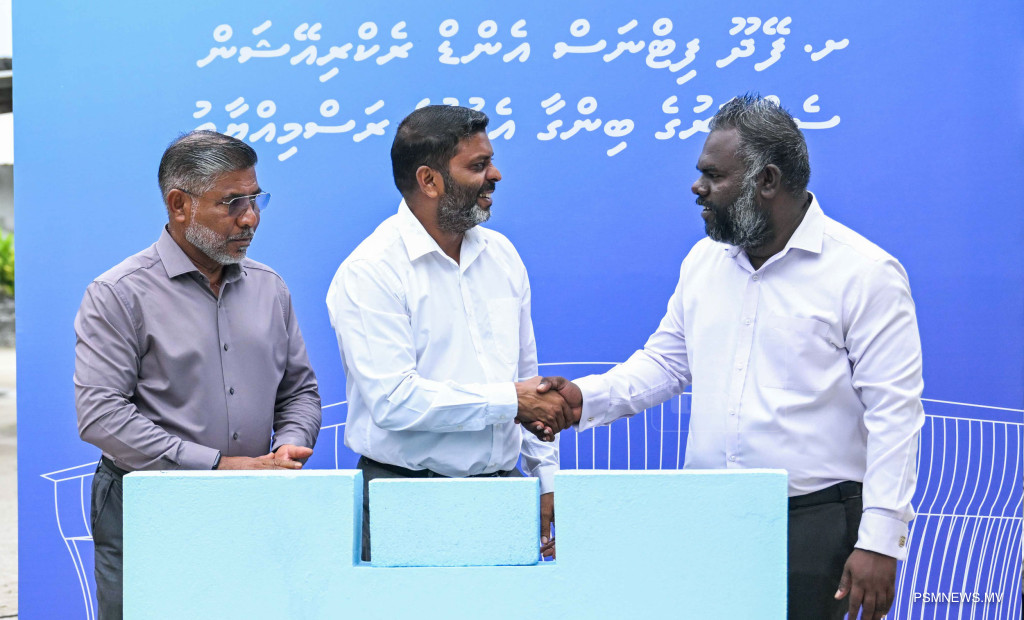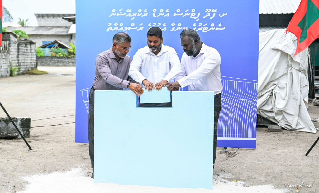 ށ. ފޭދޫގައި އިމާރާތްކުރާ ފިޓްނެސް އެންޑް ރެކްރިއޭޝަން ސެންޓަރުގެ ބިންގާ ކުޅިވަރާއި ހަށިހެޔޮކަމާއި ބެހޭ ވަޒީރު އަބްދުﷲ ރާފިއު އަޅުއްވައިދެއްވަނީ / ފޮޓޯ - ރައީސް އޮފީސް