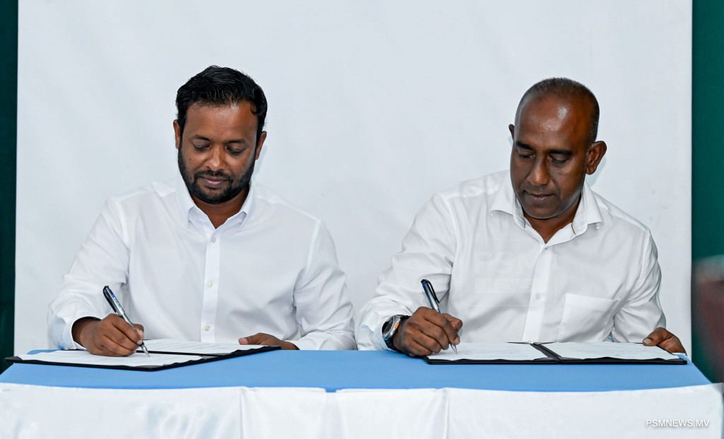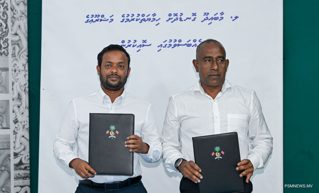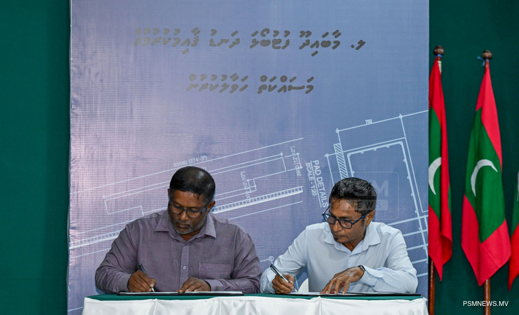 ލ. މާބައިދޫ ފުޓްސަލް ދަނޑު ޤާއިމްކުރުމުގެ މަސައްކަތް ހަވާލުކުރުމުގެ އެއްބަސްވުމުގައި ކުޅިވަރާއި ހަށިހެޔޮކަމާ ބެހޭ ވުޒާރާގެ ސްޓޭޓް މިނިސްޓަރ ޢަބްދުއްރައްޒާޤު އިބްރާހީމް އަދި އާރްޑީސީގެ މެނޭޖިންގ ޑިރެކްޓަރ އިބްރާހިމް ނަޒީމު ސޮއިކުރައްވަނީ / ފޮޓޯ: ރައީސް އޮފީސް