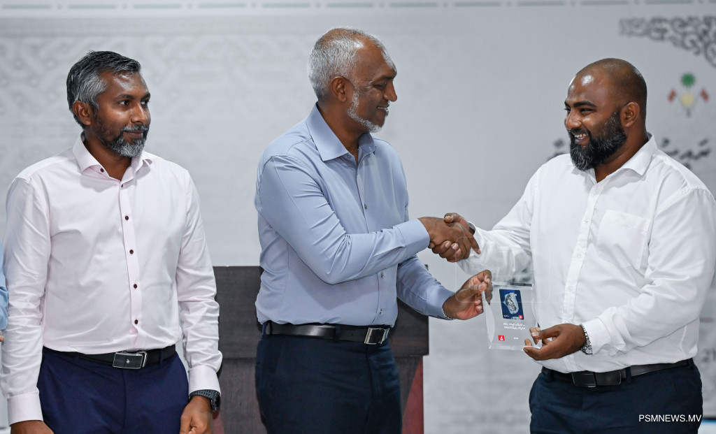 ލ. މާބައިދޫގައި ބީއެމްއެލްގެ އޭޓީއެމް ހިދުމަތް ރަސްމީކޮށް ފެށުމުގެ ގޮތުން ހަދާނީ ފިލާ ރައީސުލްޖުމްހޫރިއްޔާ ޑރ. މުޙައްމަދު މުޢިއްޒު ލ.މާބައިދޫ ކައުންސިލްގެ ރައީސް އިބްރާހިމް ވިޝާމްއަށް ހަވާލުކޮށްދެއްވަނީ / ފޮޓޯ - ރައީސް އޮފީސް
