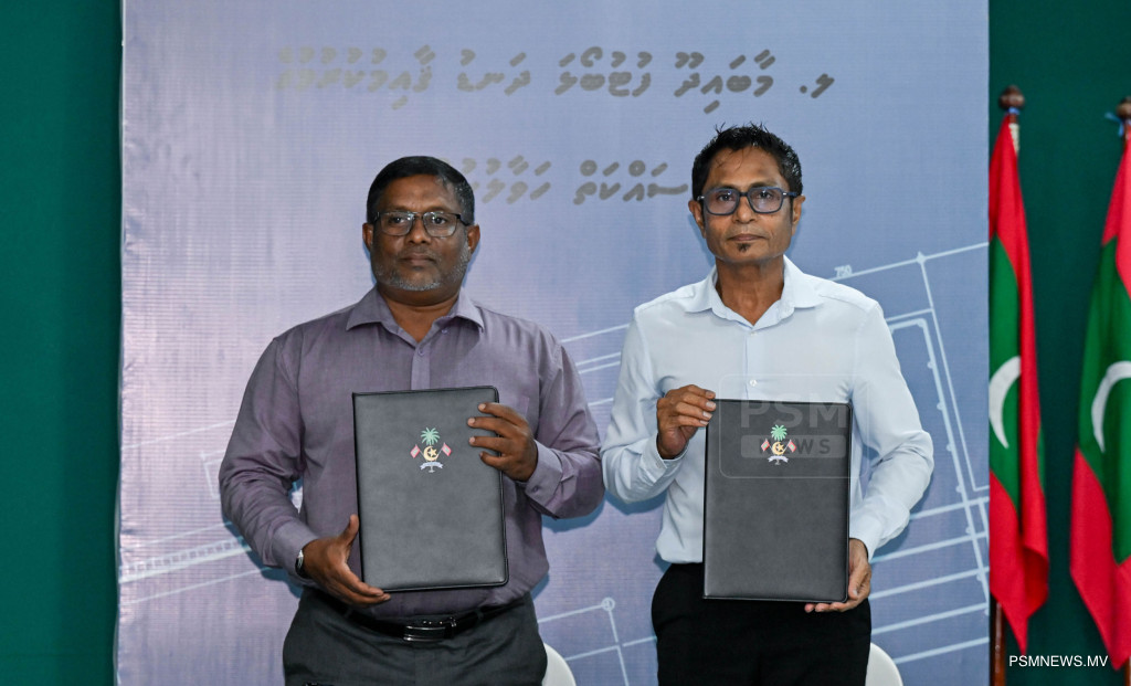 ލ. މާބައިދޫ ފުޓްސަލް ދަނޑު ޤާއިމްކުރުމުގެ މަސައްކަތް ހަވާލުކުރުމުގެ އެއްބަސްވުމުގައި ކުޅިވަރާއި ހަށިހެޔޮކަމާ ބެހޭ ވުޒާރާގެ ސްޓޭޓް މިނިސްޓަރ ޢަބްދުއްރައްޒާޤު އިބްރާހީމް އަދި އާރްޑީސީގެ މެނޭޖިންގ ޑިރެކްޓަރ އިބްރާހިމް ނަޒީމު ސޮއިކުރެއްވުމަށްފަހު / ފޮޓޯ: ރައީސް އޮފީސް