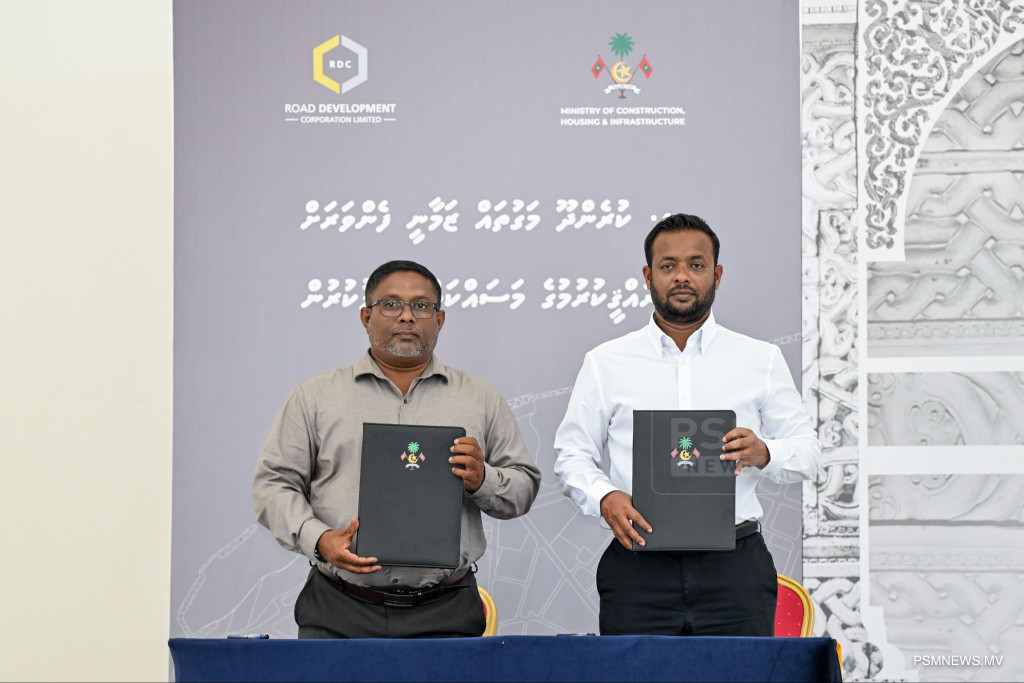 އަދި މަގުތައް ޒަމާނީ ފެންވަރަށް ތަރައްޤީކުރުމާއި ގުޅޭ އެއްބަސްވުމުގައި ސަރުކާރުގެ ފަރާތުން ސޮއިކުރެއްވީ އިމާރާތްކުރުމާއި ގެދޮރުވެރިކަމާއި ބިނާރާބެހޭ ވަޒީރު ޑރ. ޢަބްދުﷲ މުއްޠަލިބެވެ. އަދި އަދި އާރްޑީސީގެ ފަރާތުން ސޮއިކުރެއްވީ އެ ކުންފުނީގެ މެނޭޖިން ޑިރެކްޓަރ އިބްރާހީމް ނަޒީމެވެ.